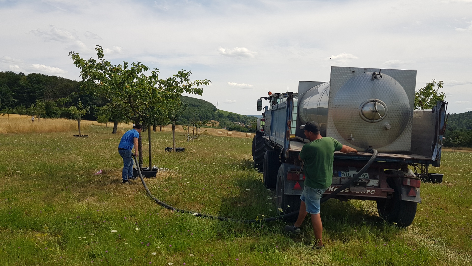 Eine Methode, wie das Wasser langsam versickern kann und somit an der richtigen Stelle ankommt, zeigte der LPV in der vergangenen Woche in Zusammenarbeit mit dem Landschaftspflegeteam des Staatlichen Bauamtes Aschaffenburg sowie einem Landwirt in Elsenfeld. Rund 40 Jungbäume erhielten eine Wassergabe von je 100-120 Litern. Dabei kamen Mörtelwannen zum Einsatz, die unten angebohrt wurden, so dass das Wasser langsam einsickern konnte. Der zeitliche Mehraufwand (Aufstellen der Wannen, Einfüllen des Wassers, nach Versickerung wieder Einsammeln der Wannen) lohnt sich, denn durch diese Technik wird kein Tropfen Wasser vergeudet und die Anzahl der Wässerungsgänge reduziert sich. Das kostbare Nass gelangt in tieferes Erdreich, wo sich das Wurzelwerk gut entwickeln und den Baum mit Wasser und Nährstoffen versorgen kann. Je nach Witterung wird der Bewässerungsvorgang im Sommer ca. alle drei Wochen wiederholt.