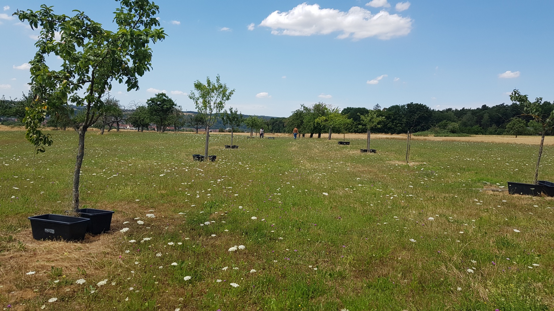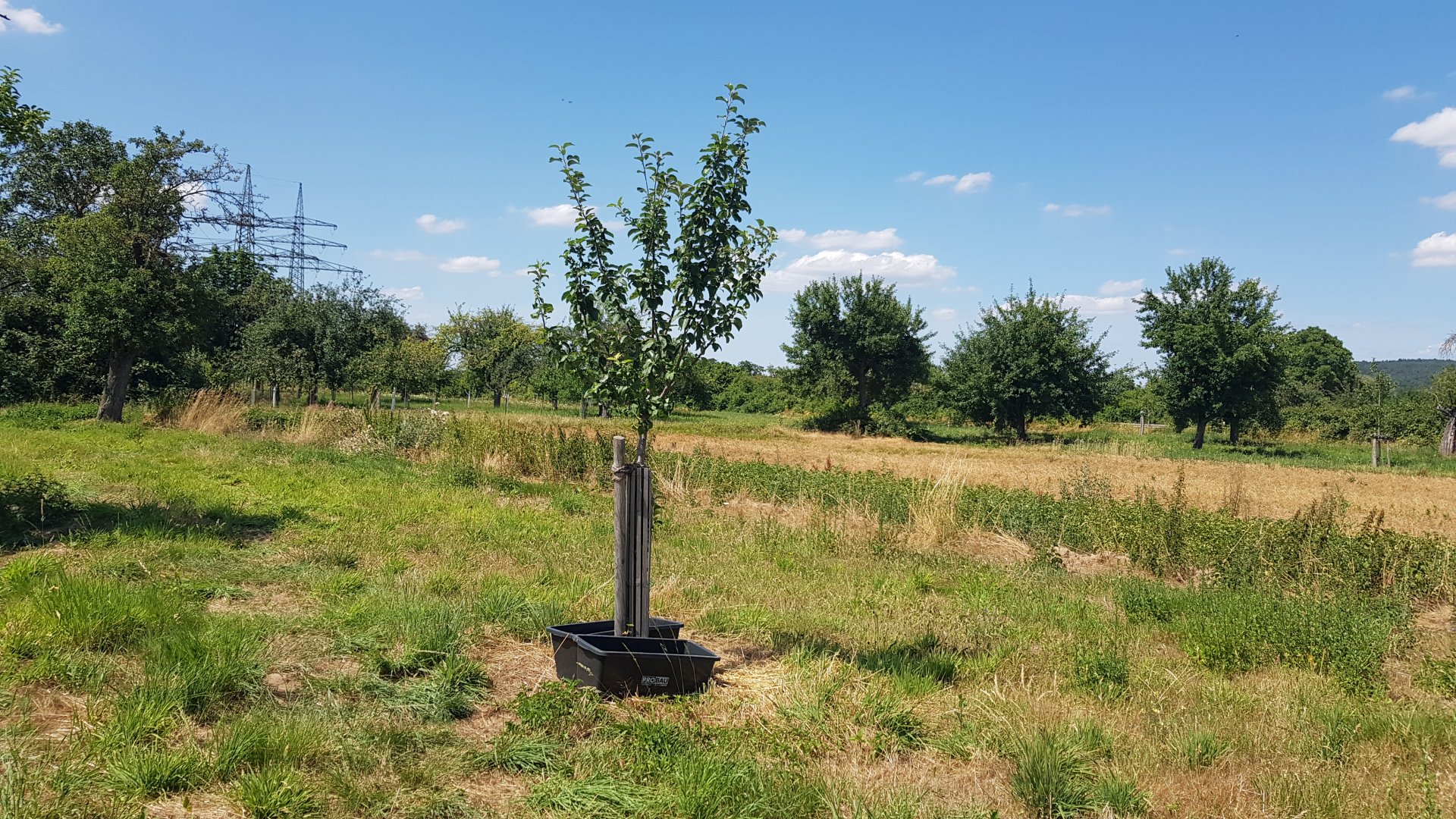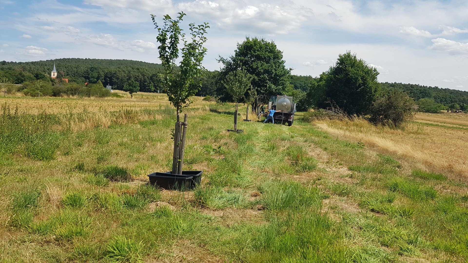 Bei der Neupflanzung von Obstbäumen ist einer der wichtigsten Aspekte, dass die Jungbäume in Zeiten des Klimawandels ohne zusätzliche Bewässerung nicht mehr auskommen. Auch in diesem Jahr gab es schon längere Trockenperioden. Seit etwa Mitte März liegen die Niederschlagswerte unter dem langjährigen Durchschnitt - zu wenig für ein gesundes Wachstum der Jungbäume.