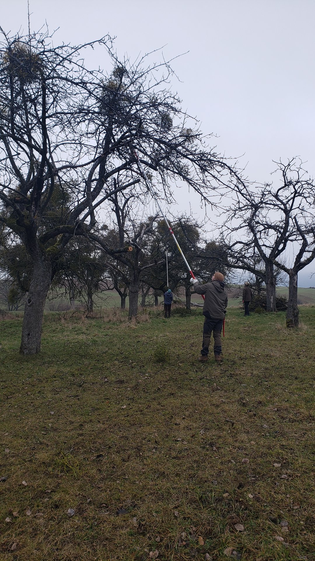 Nach einem kurzen Briefing machte sich die Gruppe ans Werk. Fünf zertifizierte Landschaftsobstbaumpfleger schnitten fachgerecht die Misteln aus den Bäumen. Sie wurden unterstützt von engagierten Helfern, die das Schnittgut aufräumten und nach Anleitung auch selbst mit Teleskopsäge und Schneidgiraffe aktiv waren. Allen Mitstreitern machte es sehr viel Spaß und das Ergebnis konnte sich wirklich sehen lassen: rund 15 teils sehr stark befallene Obstbäume wurden von der Mistel befreit und können im Frühjahr wieder ordentlich durchstarten. Das LPV-Team bedankte sich bei allen mit einem Imbiss und kalten und heißen Getränken.