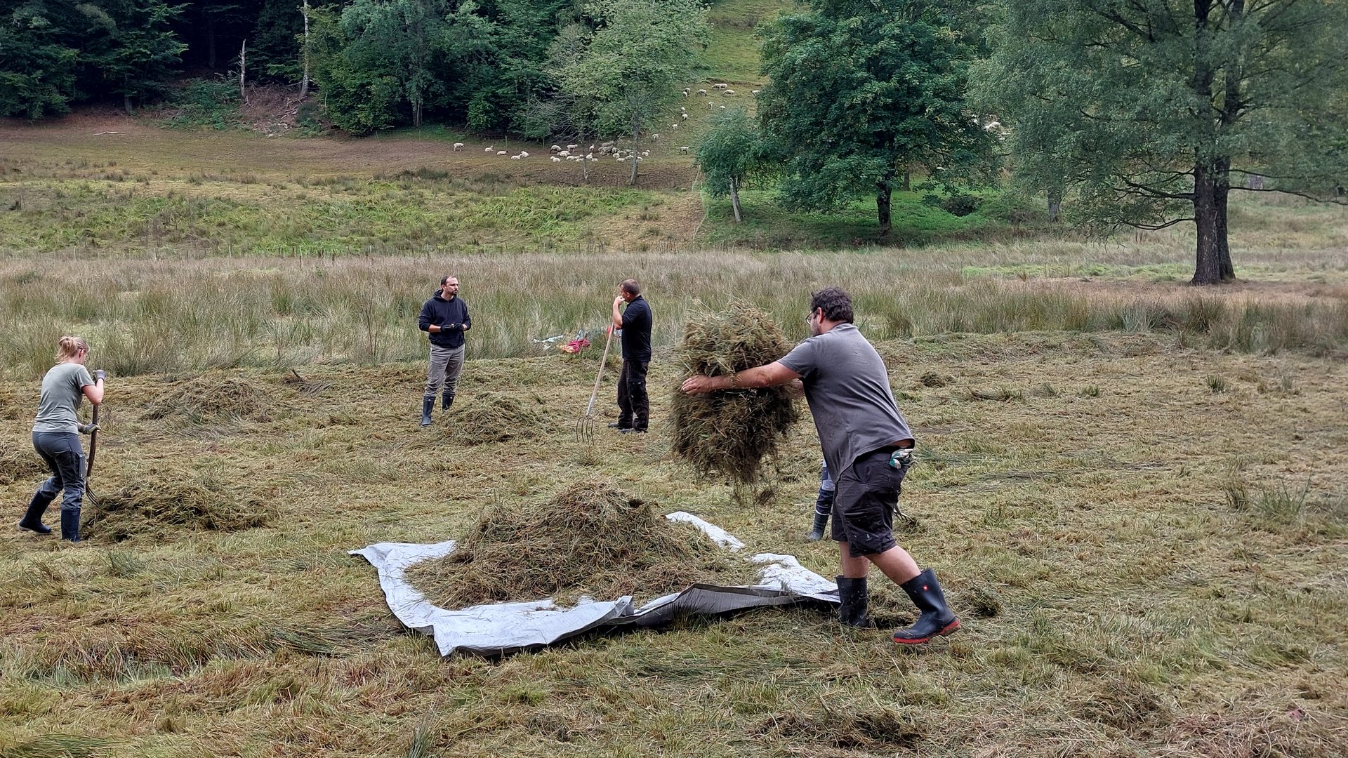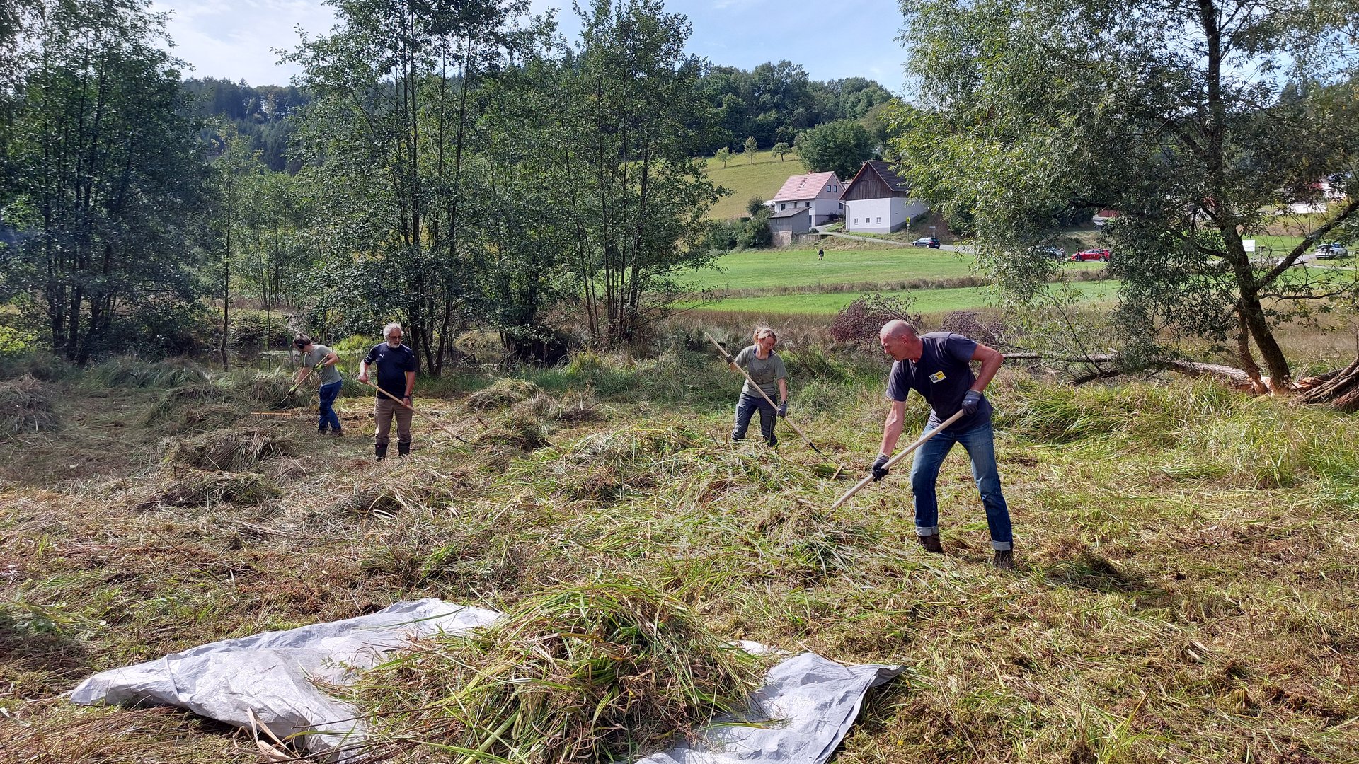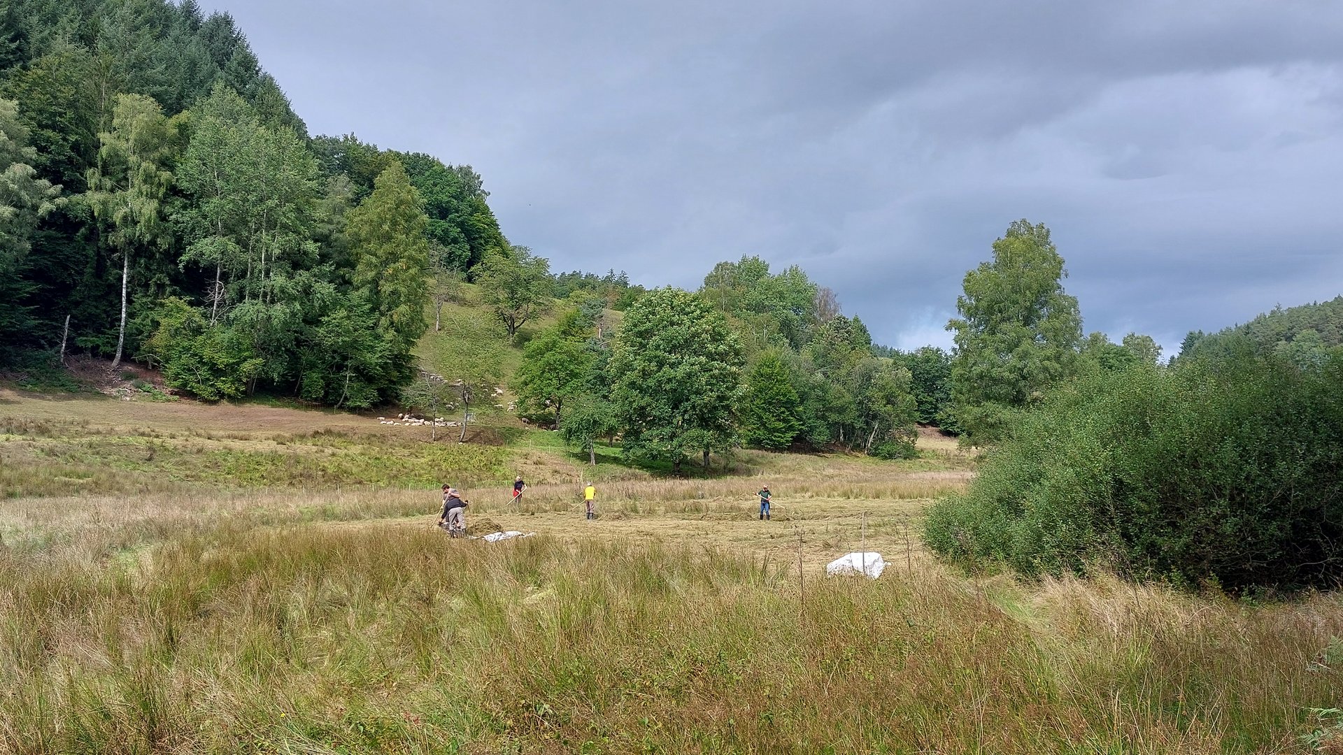 Naturschutzgebiet Eutergrund bei Bullau, 13.09.2025 – Am vergangenen Wochenende führten 15 engagierte Ehrenamtliche in der einzigartigen Kulisse des Bullauer Eutergrunds am Rande unseres Landkreises erfolgreich eine Landschaftspflege-Aktion durch. Die TeilnehmerInnen mähten die Nasswiesen, rechten das schwere Material ab, entfernten konkurrierende Pflanzen im Bereich der seltenen Moosbeere und leisteten so einen wichtigen Beitrag zum Erhalt dieses wertvollen Lebensraums. Die Arbeiten erfolgten in Handarbeit mit Motorsense, Rechen und Heugabel, um die empfindlichen Ökosysteme des Eutergrunds bestmöglich zu schonen.