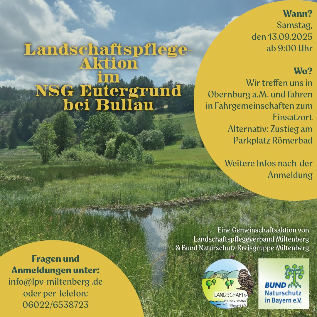 Am südlichen Ende unseres Landkreises, bei Kirchzell, liegt das Naturschutzgebiet Eutergrund. Das Feuchtgebiet wird zum Tal händisch gepflegt. Bei dieser Aktion soll ein Teil gemäht werden und das Mähgut soll von der Fläche entfernt werden. Fahrgemeinschaften ab Obernburg, Zustieg bzw. Treffpunkt am Parkplatz "Römerbad".